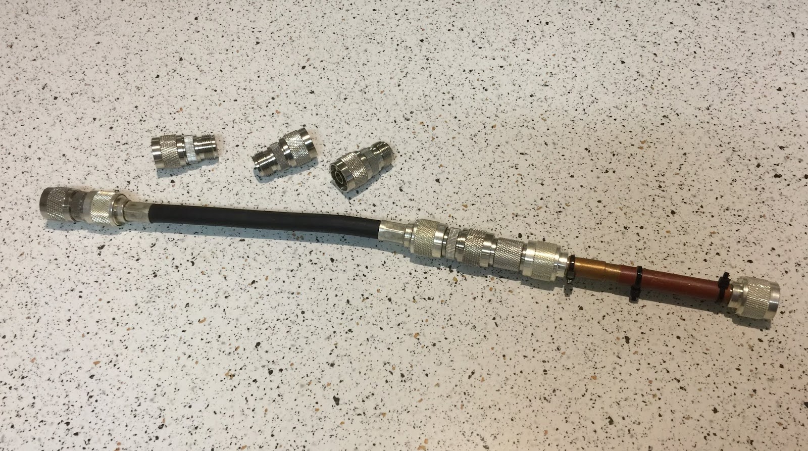 A tee junction and two more cables connects the two branches with the antenna feed line.